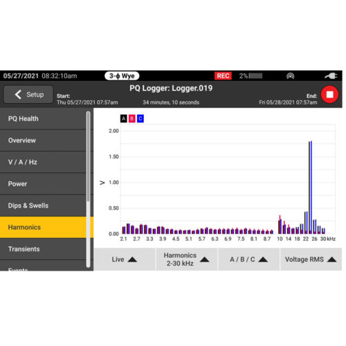 - Eenvoudig weergeven van gegevens over V/A/Hz, vermogen, dalingen, stijgingen en harmonischen